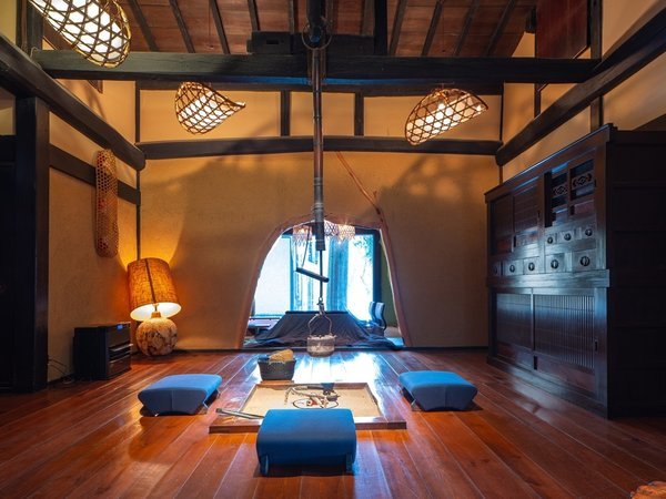 約170年前の豪農宅を移築した母屋の玄関に入ると囲炉裏火が旅の疲れを癒してくれます。1万5千坪もの大自然の中にわずか8室の贅沢な造り。温泉は、1枚ガラスの向こうに広がる山里の風景を望む檜風呂や、野趣あふれる岩風呂で楽しむことができます。