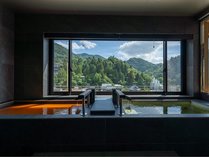 客室は全てしつらえが異なり、金泉の露天風呂を設けたラグジュアリー感を楽しんで頂ける造りです。食事では調理人との会話や手捌きを楽しみながら四季の旬をお楽しみください