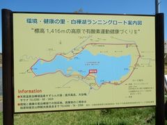 白樺湖を一周できるランニングロードが整備されています。特に、この案内図がある南側は白樺湖の向こうに車山高原が見え、おすすめです。