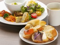 朝食は中庭を眺めながら、山川牧場の乳製品や焼きたてパンが楽しめるおしゃれなプレートで、大満足でした。