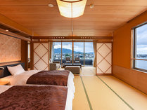夕日に染まる城下町と日本海を客室テラス、半露天風呂から愉しむ◆新規改装のコーナービューのジュニアスイート、温泉露天スイートでとっておきの大人の休日、自分へのご褒美旅◆夕食は萩のご馳走を味わう
