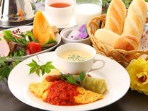 朝食はスープ、デミグラスソースかけのオムレツ、パン3種類。どれも美味しいかったです。