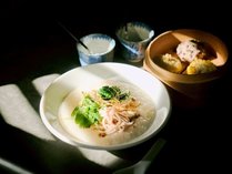 朝食はクレープ3種類、お粥と蒸籠蒸し(天心?)のセット、パウンドケーキ&サラダにドリンクがつきます。