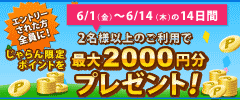 2名以上の予約でもれなく全員 最大2000円分の ポイントプレゼントキャンペーン! |
