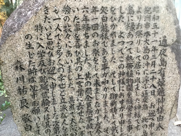 【通夜島有姫龍神】(つやしまありひめりゅうじん)の由来について書かれている石標を読みますと、個人の方がお祀りされているようです。「昭和51年3月28日。お迎へ申しました。紀洲串本大島の沖に浮ぶ通夜島。此の島に太古よりお祭りして居られました神様です。私この島に縁あって熱帯植物園を経営する事になりました。よつてこの神様におすがり申したいと心をひかれました。そして御祈祷して戴きました処白龍様である事がわかりました。それから一年一回のお祭をして来ましたが丁度今年で二十六年経ちました。其の間全員無事故で守って戴いた事を喜び其の上言葉に表せない不思議な霊験の数々にあいました。其れで大阪の皆々様にも一人でも多くの幸せと立派な人を出身して戴きたいと思ひお迎へ申しました次第です。特に入学及び就職試験又は其の他困つた事の生じた時は必ずお願いして下さい。」 住所:大阪府八尾市神立4丁目 アクセス:近鉄服部川駅より徒歩約20分。 #japan #travel #jaran #journal #Sakamoto119 #じゃらん #旅行 #旅行記 #社寺 #神社