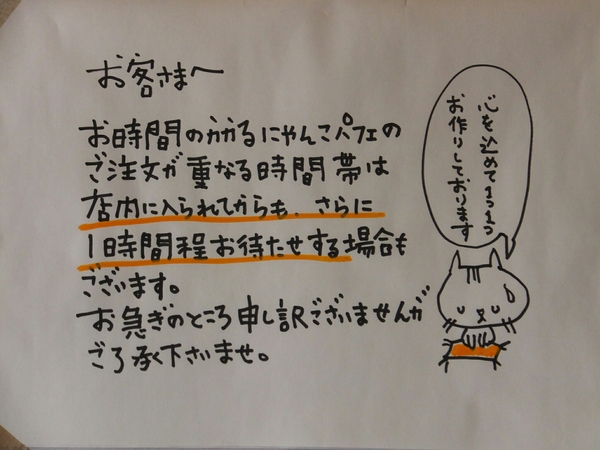 入店から食べ終えるまでに2時間ほどかかりましたが、丁寧に作られているからなんですね。 入り口にも貼り紙がありました。 でも本を読みながらまったりと寛いでいると待ち時間も気になりません。