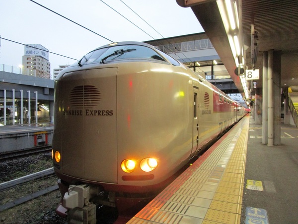 寝台特急ではB寝台シングルを利用。室内は一畳半くらいの広さで、足元にまとめて枕・掛布・寝着、ちょっとした物置と鏡。頭側に照明等のスイッチ類、なんとも簡素な個室 写真左側が大きな窓になっているが、夜行なので富士山も見えず、曇りで星も見えず、通過する駅の照明だけがまぶしかったです。