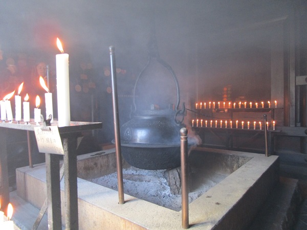 不消霊火堂(きえずのれいかどう)の中 弘法大師の修行から1200年燃え続けているという また、広島平和記念公園の「平和の灯」の火元の一つだそうです。外国の方達が煙いのを我慢して佇んでいるので驚きました。