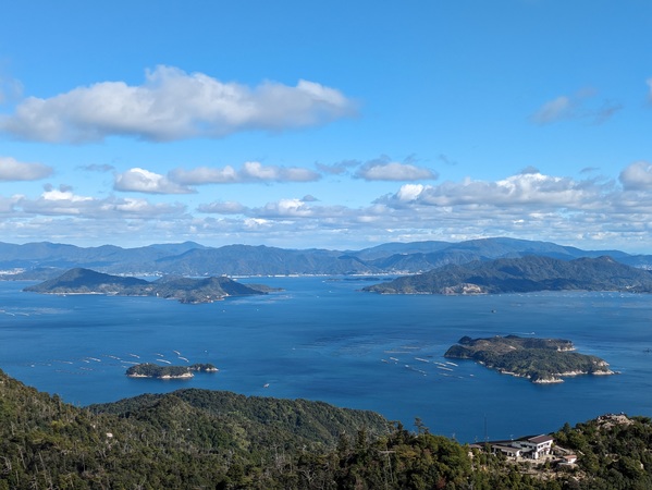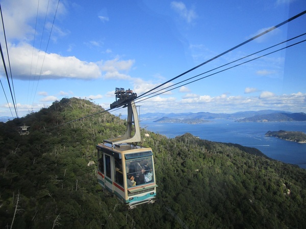 ロープウエイで弥山に向かう 写真はロープウエイから見た瀬戸内海の島々 ここで晴れ女の娘がやっと本領発揮、みるみる晴れ間が広がってきました。