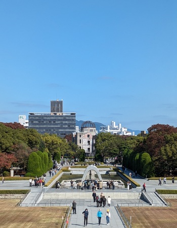 資料館から平和記念公園へ 平和記念資料館から記念公園、原爆ドームまで、修学旅行の生徒たちを除くと、半数くらいが外国の方でした。そして外国の方のほうが時間をかけて熱心に見学しているようでした。決して日本人が不熱心というのではなく、ツアーの時間内で見ているからでしょう。