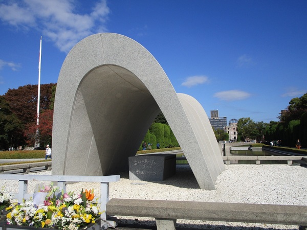 慰霊碑に手を合わせました。写真では判りづらいですが、慰霊碑の後ろに「平和の池」があり、奥に「平和の灯」があります。原爆の犠牲者が水を求めて死んでいったことを慰めるため池を配置し、二度と同じことが起きないよう、『安らかに眠って下さい 過ちは繰返しませぬから』と碑文があります。 今の世界はどうでしょう?あちらこちらで悲惨な戦争があります。本当に過ちは繰返されないのでしょうか。