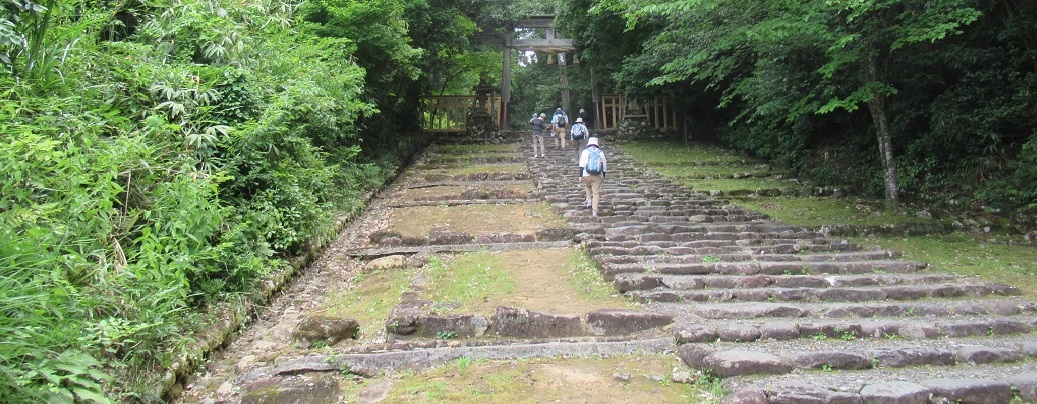 石碑の立つ道は旧道の石畳の道、、それに沿って軽舗装の参道が並行してある