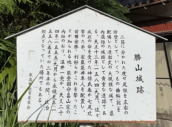 勝山城は1584年(天正12年)佐々成政の命を受けて、越中射水郡の守山城主・神保氏春が七尾城の押えとして築いた山城。本丸・二の丸・三の丸・堀切などが残る。『日本城郭大系 7』