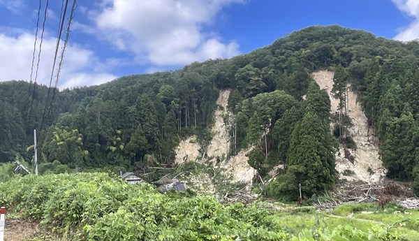 輪島市西山町、県道277号沿い。岩壁が大きく崩れ、家屋が押しつぶされている。電柱も倒れた状態。傷跡は深い。