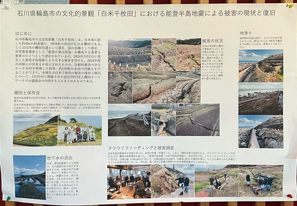 道の駅 千枚田ポケットパークの壁一面に、千枚田の復興プロジェクトのリポートや応援メッセージが貼られている。