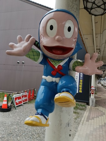 無料駐車場があり有難かったです。 商店街にキャラクターがありますが、シャッター街で人通りが全く無く寂れて残念です。 藤子A先生が生誕された光禅寺もあります。境内にはキャラクターの石像もあります。