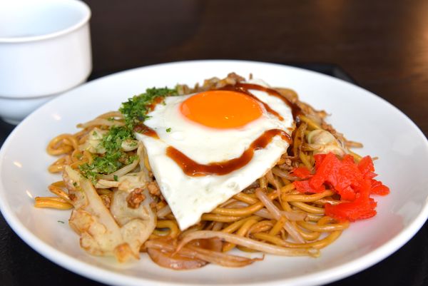 「来ましたー!」「横手やきそば」の入場ですww 「横手やきそば」は、太麺でソースは甘め、端には福神漬け、そして半熟の目玉焼きが乗ります。最後の希望が叶いました♪