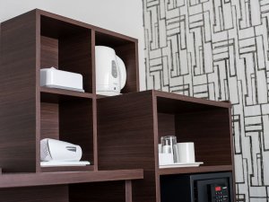 【収納棚】電気ポットやマグカップ、ミネラルウォーターなどをご用意しております。