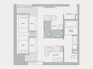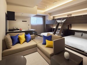 スーペリアバンクはクイーンベッド2台の上段にシングルベッド2台を設置したバンクベッドの特別なお部屋です。天井高の高い40u超の広々とした室内はデザイン性の高い落ち着きのある空間です。最大6名までご宿泊いただけます。
