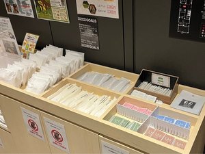 【アメニティバー】フロントに各種アメニティとガウンをご用意しております。