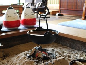 いつでも自由にロビーとして寛ぐことが出来る大囲炉裏 読書、喫茶、夕食後のデザートや談笑のひとときを