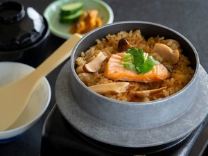 秋が旬!鮭と松茸の釜飯は食欲をそそるかぐわしい香。