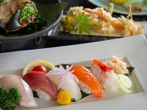 今年の秋色会席は鮮魚を寿司と舟盛り、あわびをほう葉味噌で姿焼きに。