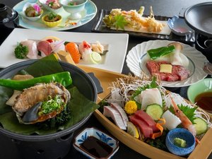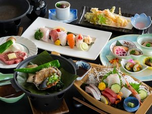 秋色会席。あわびにステーキ、寿司に舟盛りまで!