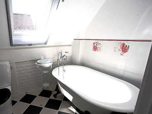 小さな天窓付のバスルームにあるお風呂は、本格的な猫足付のバスで、まるで外国にいるような気分?になります。