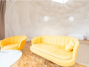 当ホテルのグランピングは、一棟一棟が個別のウッドデッキ上に建てられており、8メートルの大型ドームテントを使用。グランピング内にはゆったりくつろげるソファやハンモックを完備しております。