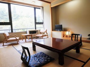 ゆったりとした客室からは、銅山川のせせらぎと、出羽の山並みが眺望できます。