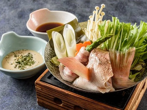 ■ご夕食は、庄内の夏の味覚を盛り込んだ『メバルと夏野菜・山形牛の旬彩料理』をご用意しております。メインは脂がのったメバルを地元のブランド豚「山伏豚」と一緒に鍋物に、地元の新鮮な夏野菜は揚げびたしにてご提供。山形県のブランド牛「山形牛」は鉄板焼きと冷しゃぶサラダでご用意。羽黒の広大な大自然で育てられた「わんぱく卵」を使用した茶碗蒸しなど、見た目も華やかで美しく、旬の食材にこだわって作り上げた特別コースをぜひお召し上がりください。