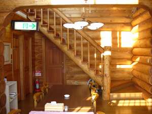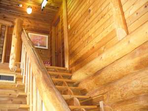 ログハウス2階への階段。2階建てのログは大人数のお客さまもゆったりできます。