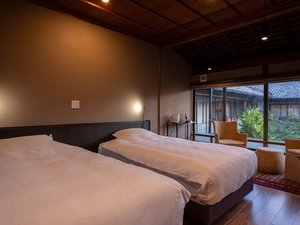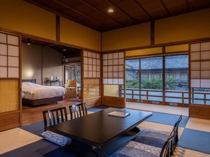 琉球畳が印象的な和洋室。10畳の和室と落ち着きあるベッドルームからは中庭を眺めることができます。客室にお風呂が備わっていないため、館内二か所のお風呂をご利用下さいませ。