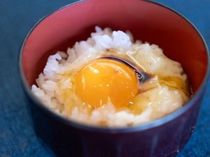 朝炊き立ての只見産のつやつやふっくらご飯。会津地鶏の初卵の卵をかけた究極の『卵かけご飯』!