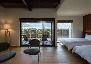 由布岳を望める半露天風呂がついている洋室タイプ。気候のよい時期はテラスでお寛ぎいただけます。