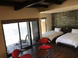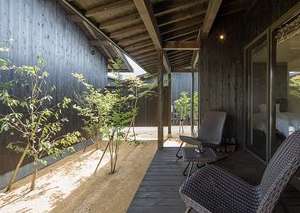 由布院の風が心地よい半露天風呂がついている洋室タイプ。気候のよい時期はテラスでお寛ぎいただけます。