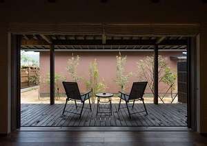 由布院の空、自然が感じられる洋室の離れ。気候のよい時期はテラスでお寛ぎいただけます。