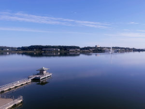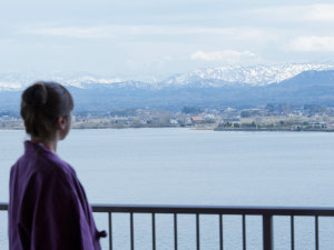 柴山潟が一望でき、白山連峰に上がる朝陽が望める絶景のお部屋70m級の大噴水と浮御堂も眼前に広がります