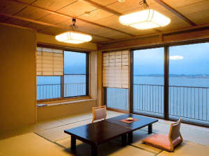 紫水館お部屋一例(夕景が綺麗な時を刻む日本海側の湖畔が望めます)