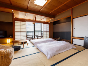 眼前に広がる湖畔の景色をひとり占め!お部屋の家具、寝具を一新し、事前にお布団を敷いております(一例)
