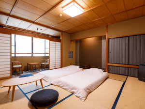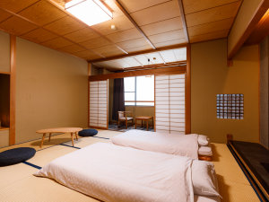 お客様のプライベート時間を守る為、スタッフの入退室をひかえ、事前にお布団を敷いております(客室一例)