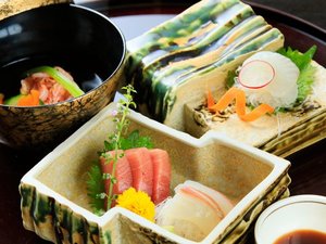 前菜・ホテル特製からし蓮根&煮玉子・吸い物・お造り・煮物・焼き物・釜焚きご飯・味噌汁・お新香・フルーツ