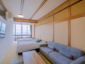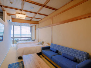 畳にツインベット、ソファーベットを配置した和モダン空間が広がるお部屋です。海が見えるお風呂付。