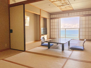 当館自慢の駿河湾眺望、10畳と6畳の2間で広々とした和室タイプのお部屋です。襖で仕切ることができるお部屋ですので、ご家族様でも気兼ねなくご利用いただけます。窓の外にベランダもございますので、駿河湾の景色や西伊豆の夕陽をご堪能下さい。