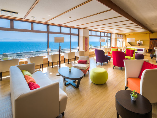 【2F ロビー】波の穏やかな三河湾が眼前に拡がる、明るく開放的でPOPな雰囲気の居心地良いロビーです