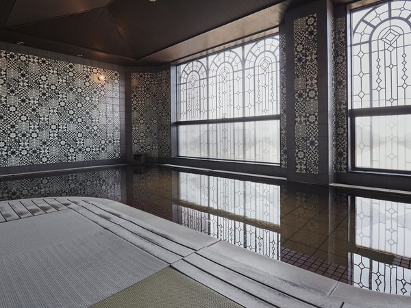 【男性大浴場】窓にはアイアンフレームを施したアールデコスタイルの大浴場※ご移動には階段がございます