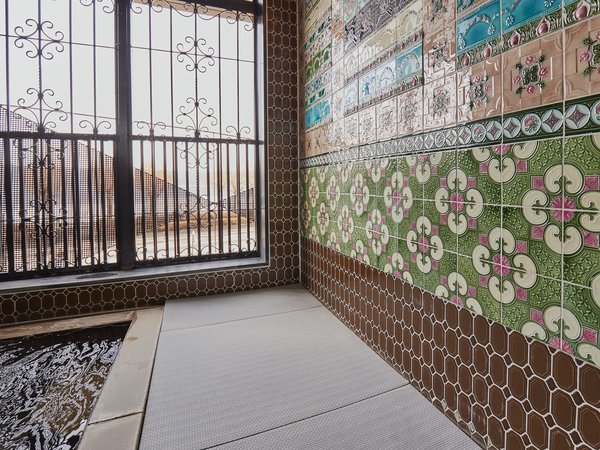 【女性大浴場】総タイル張り、窓にはアイアンフレームを施したアールデコスタイルの大浴場