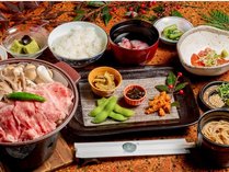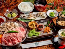 *【夕食一例(基本メニュー)】和牛の陶板焼きをメインに郷土料理が並びます。