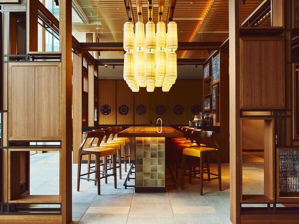 犬山の古い伝統と歴史にインスパイアされた、斬新でコンテンポラリーなデザインのレセプションスペース。